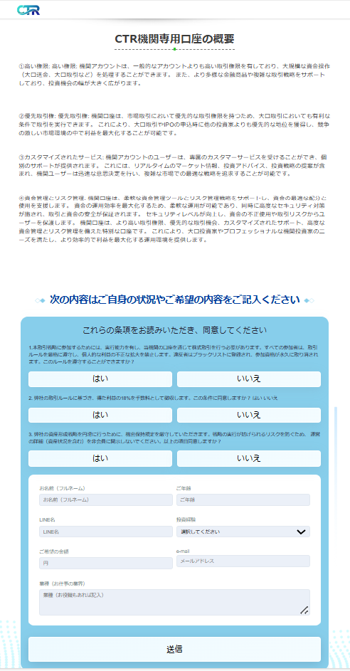 「CTR機関専用口座」は、実際には存在しない架空の取引所で、主にインターネット上で投資家を騙すことを目的としています。この取引所は、最初は信頼できるように見せかけ、資金を集めますが、最終的には出金ができなくなるなどのトラブルが発生します。 主な特徴は以下の通りです。- 魅力的な投資案件: 「CTR機関専用口座」は短期間で高いリターンを約束する投資商品を提供して、多くの投資家を引き寄せます。