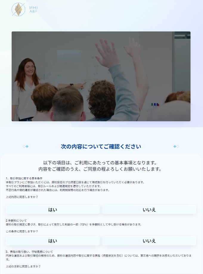 MHIABF(プロ資産口座)の公式サイトを確認したところ、金融ライセンスの有無や登録情報といった、信頼性を判断するうえで重要な情報が掲載されていませんでした。