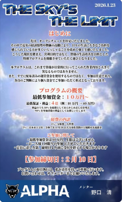 「THE SKY’S THE LIMIT~ALPHA~」は、実際には存在しない架空の取引所で、主にインターネット上で投資家を騙すことを目的としています。この取引所は、最初は信頼できるように見せかけ、資金を集めますが、最終的には出金ができなくなるなどのトラブルが発生します。 主な特徴は以下の通りです。- 魅力的な投資案件: 「THE SKY’S THE LIMIT~ALPHA~」は短期間で高いリターンを約束する投資商品を提供して、多くの投資家を引き寄せます。